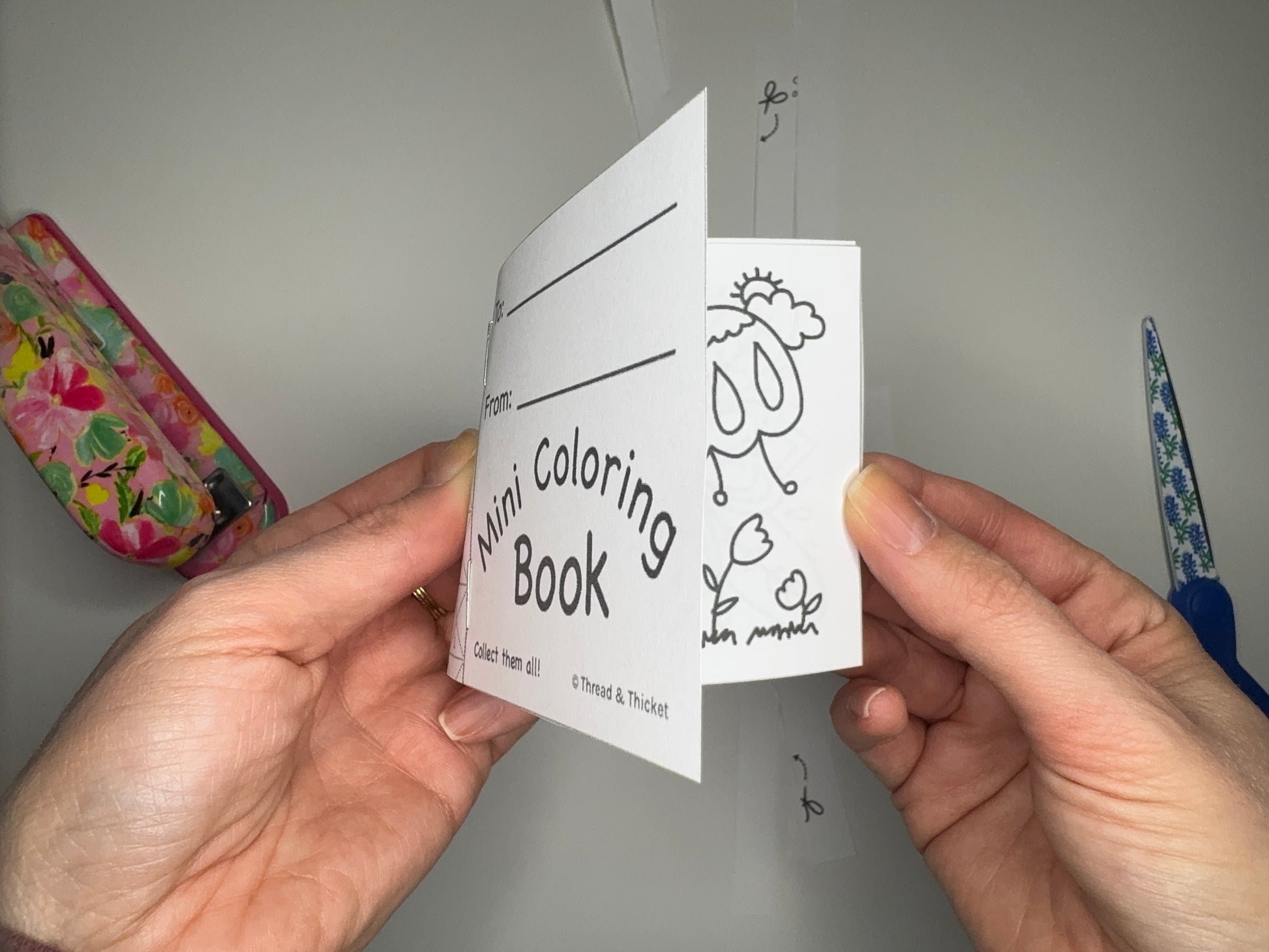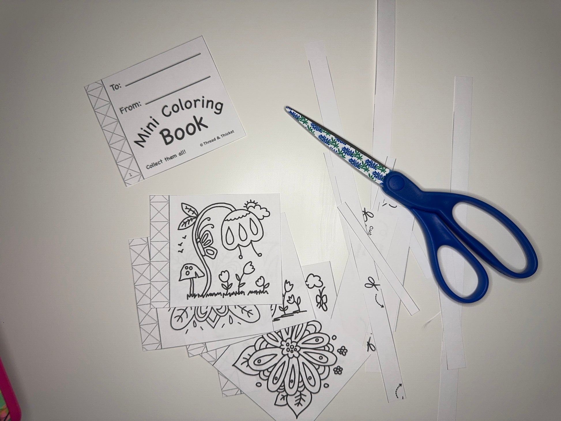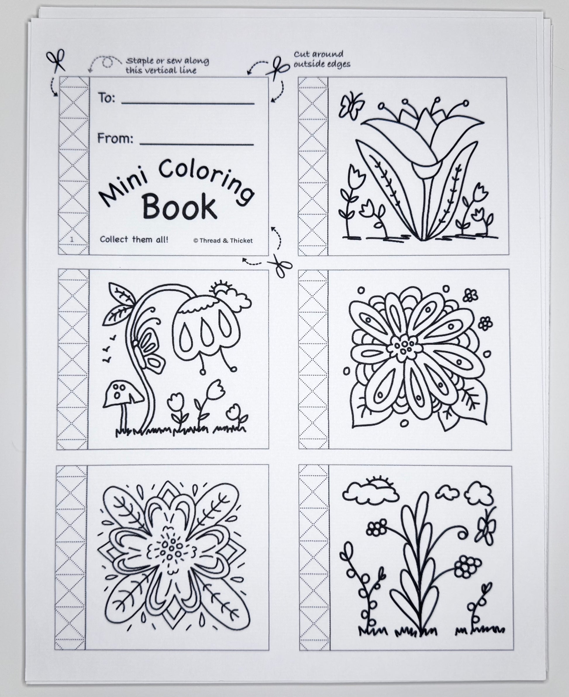 This adorable mini coloring "book" is a great little project for kids! Print it out, cut out the pages, and either staple, glue, or even sew them together to create the cutest little coloring book! Get creative with a hole punch and use it as a gift tag! Collect them all! Original artwork hand-drawn by Sara Lorraine of Thread & Thicket.